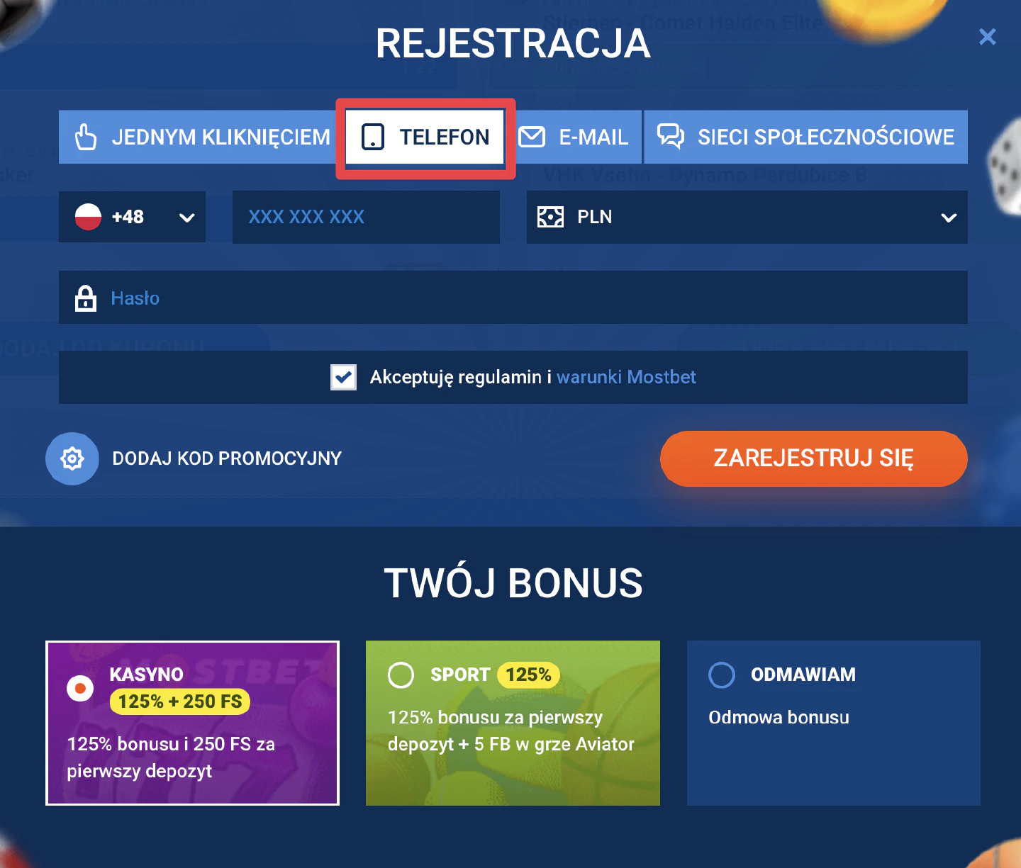 Jeśli wolisz używać telefonu komórkowego, ta opcja jest dla Ciebie. Rejestracja numerem telefonu jest szybka i bezpieczna.