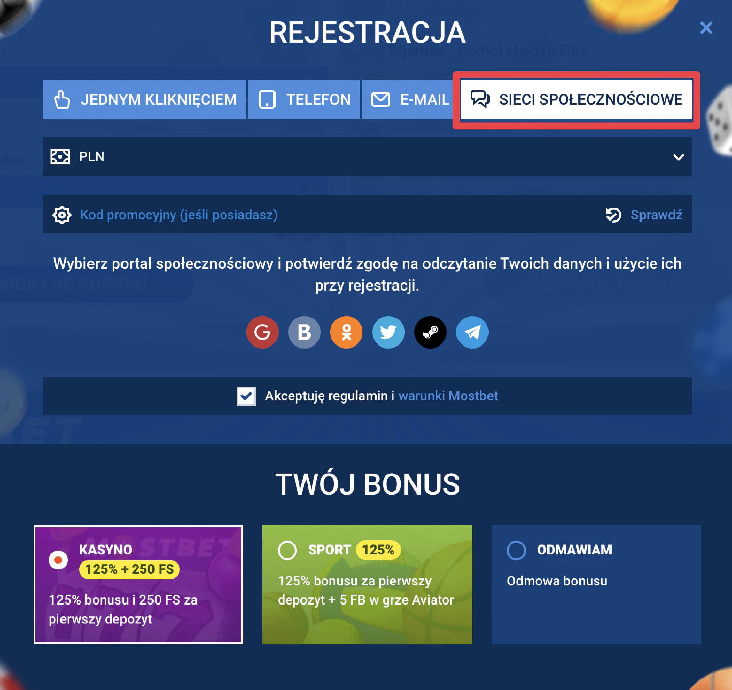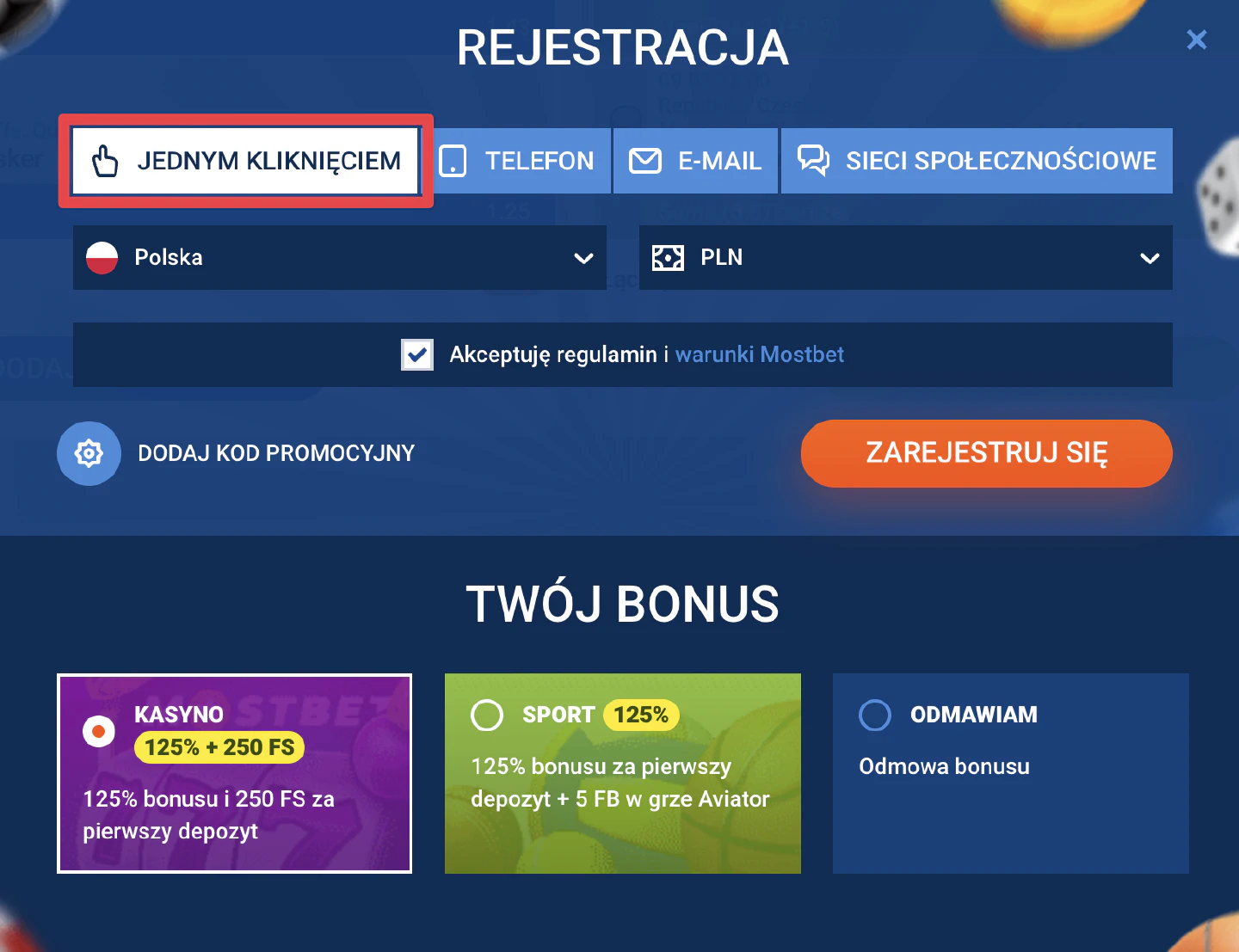 - Zdecyduj, czy chcesz otrzymać bonus powitalny – na zakłady sportowe, do kasyna, czy rezygnujesz z bonusu.
